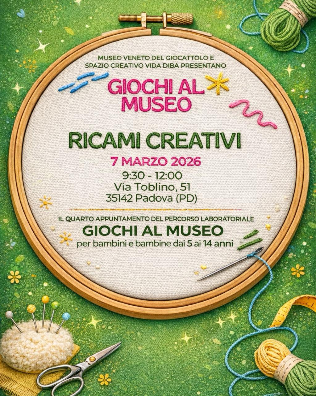 Il prossimo appuntamento e’ con RICAMI CREATIVI, un laboratorio dove i bambini scoprono in modo semplice e divertente le basi del cucito e del ricamo. Un’esperienza che stimola manualitĂ e concentrazione, ma anche fantasia e gusto estetico, trasformando fili e punti in piccole opere uniche e colorate..